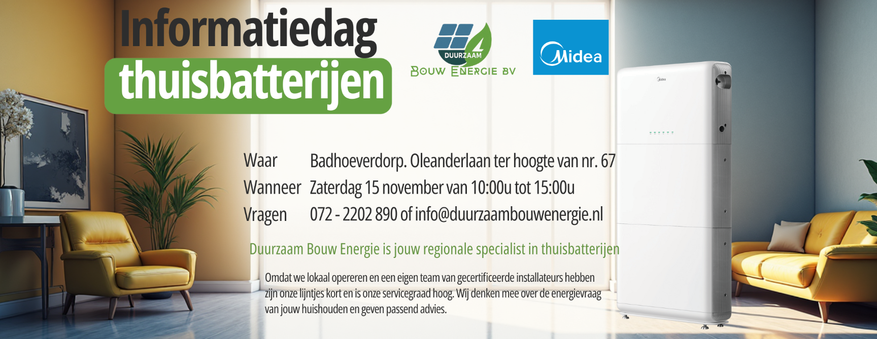 Op zaterdag 15 november geven wij een gratis informatiedag over thuisbatterijen. We nodigen je van harte uit om deze dag bij te wonen en je geheel vrijblijvend te laten informeren over wat een thuisbatterij is, wat de mogelijkheden zijn en of het iets voor jou kan betekenen.